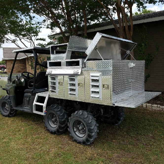 UTV aluminum boxes complete with water tank, bench seat, arm rests, drink holders, wash out floors, dry storage, louvered or open style doors, rubber mats fan and steps